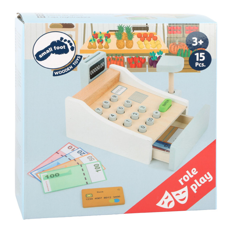 Caisse enregistreuse en bois pour enfants robuste et moderne.