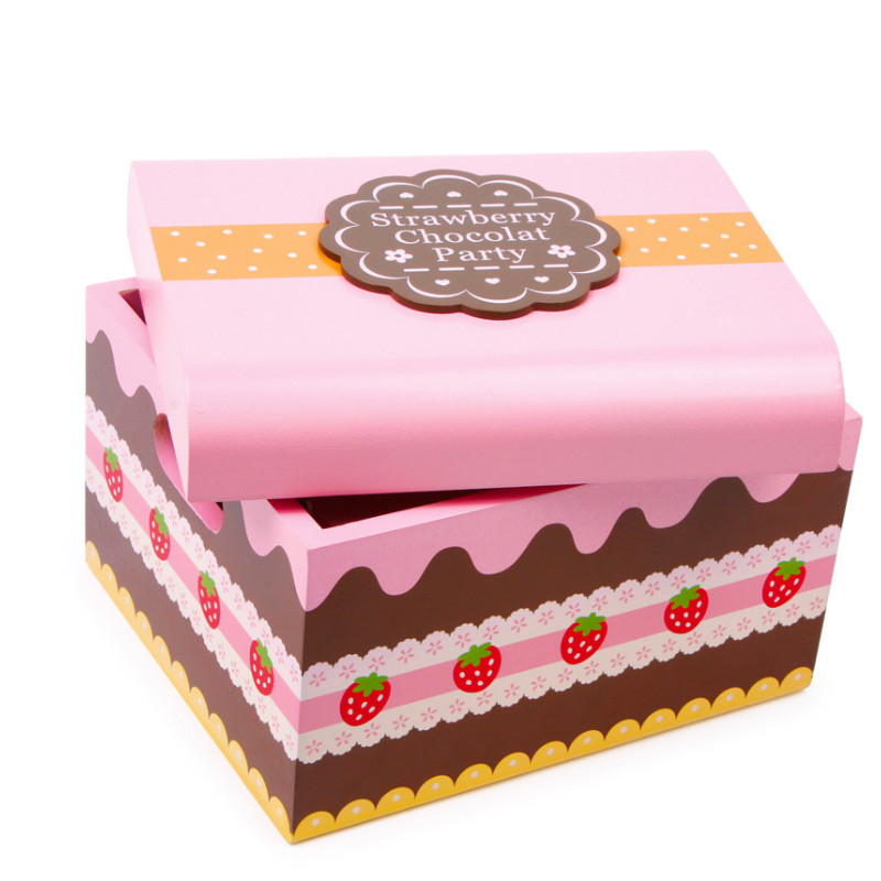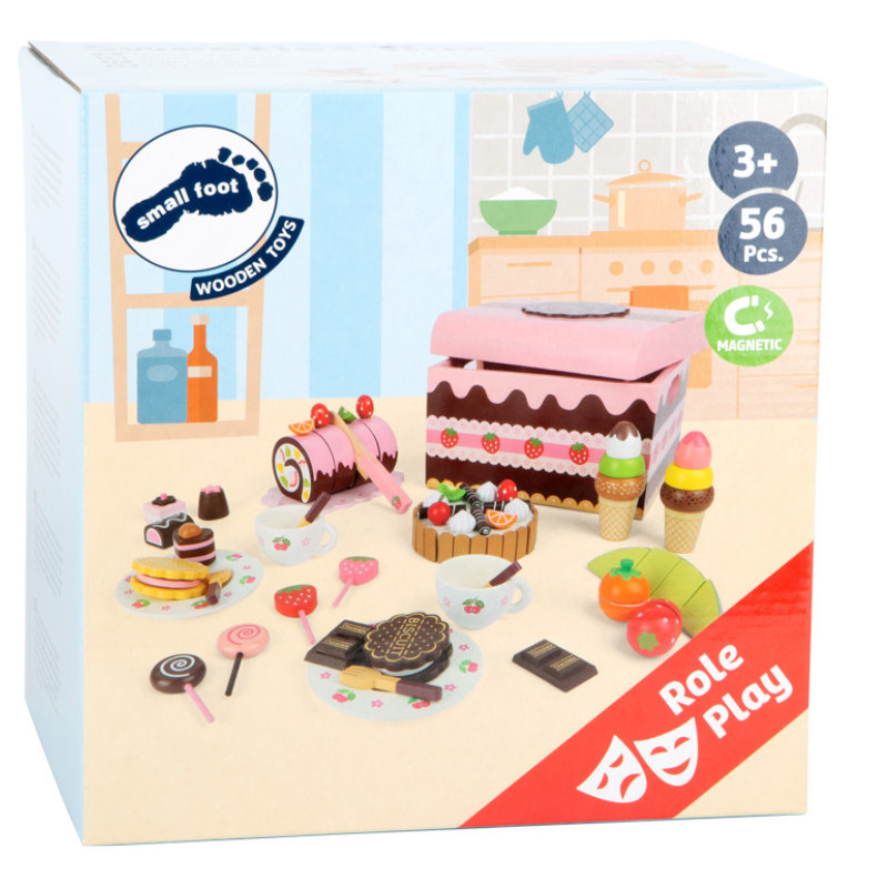 Jolie boîte à friandises en bois colorée composée de nombreux accessoires. Ce jouet en bois est idéal pour développer le sens du jeu de rôle.